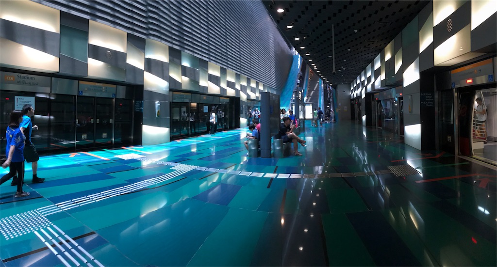 『stadium station』に到着!ちょっと宇宙みたいな駅ですね。ちらほらと浴衣を着ている方が見受けられます。